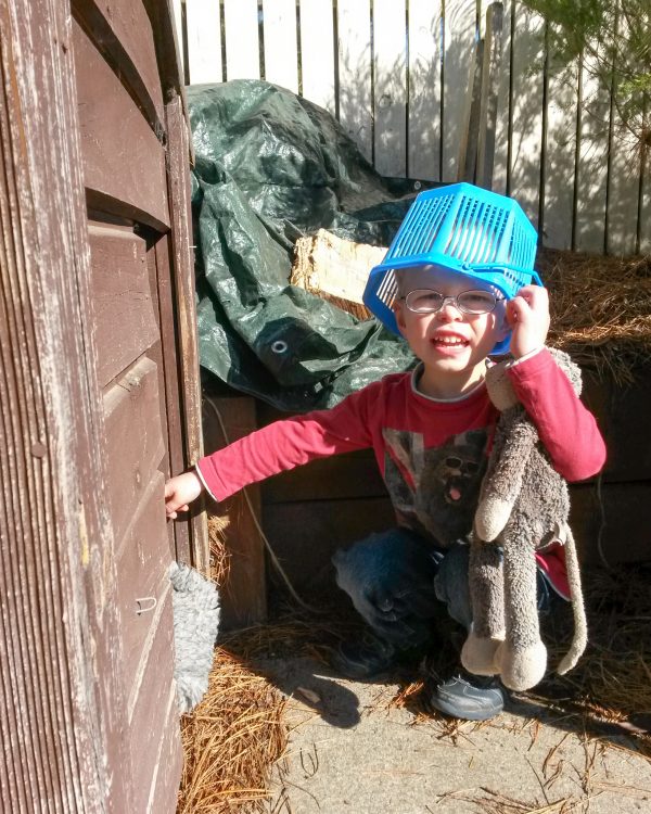 I suppose it is helping when my little friend emptied the peg basket, used it for a hat, then decided that we should both get into molly’s kennel!!!