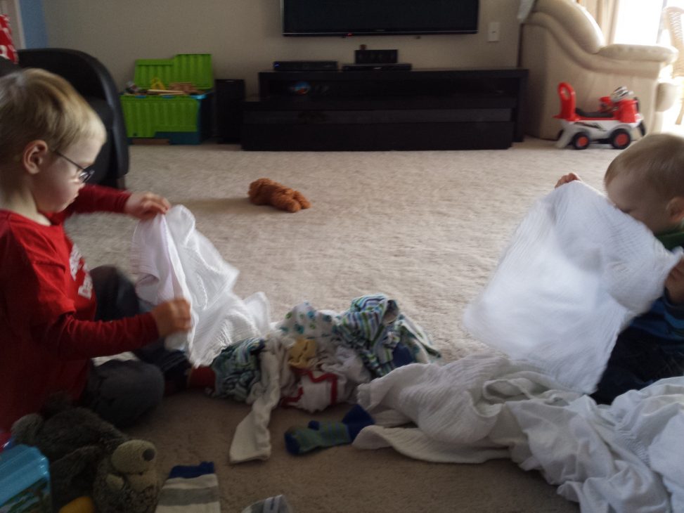 However, they were both fascinated by folding the washing and spent a lot of time examining each item. CJ even tried to fold a couple of things, while LJ was happy to throw them around…
