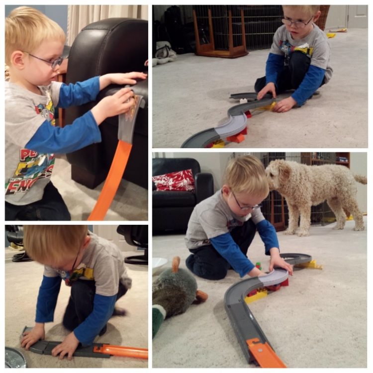 As the track is really only a couple of bits that don’t really go together, there is plenty of options to be creative when assembling it. And CJ put in 100% effort and concentration to create a very cool track – complete with banked corners with duplo supports.