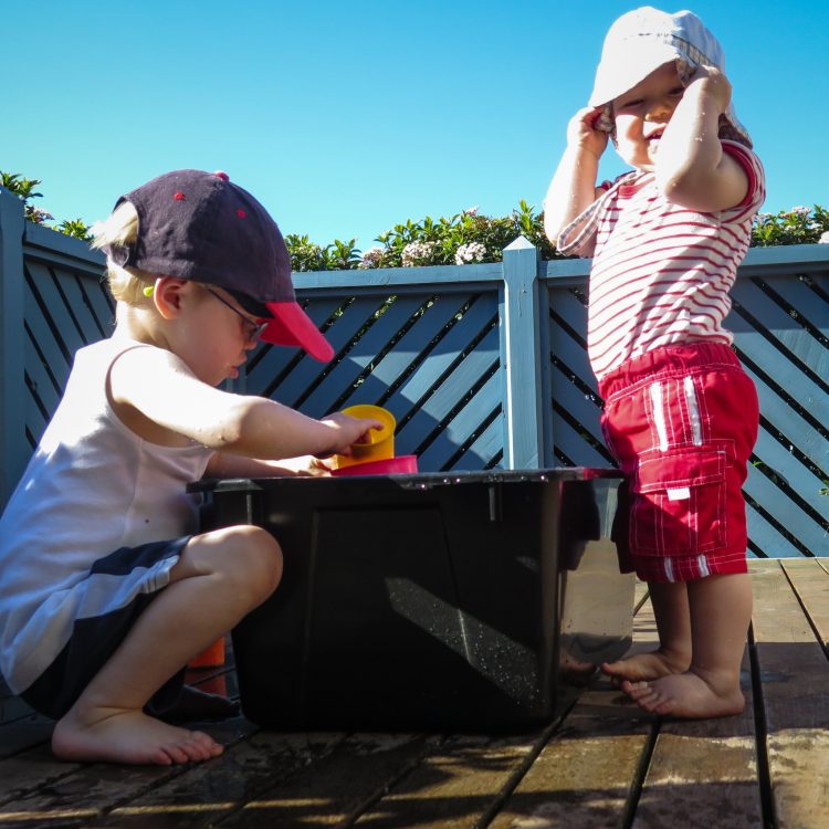 A hot day so the boys were happy to spend their afternoon playing with water. Started cautiously, but soon they were both sitting in the container, throwing water everywhere, and giggling constantly.