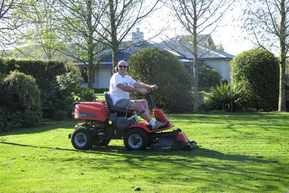 GD looking very happy with his new lawn mower, but he could only use it after he kept CJ occupied with a slalom course in our big shed.