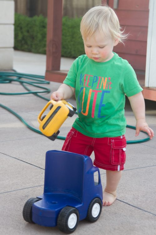 This afternoon LJ decided he was a truck mechanic – he loves connecting the trailer, loading the cars onto it, checking the engine and filing it with fuel.