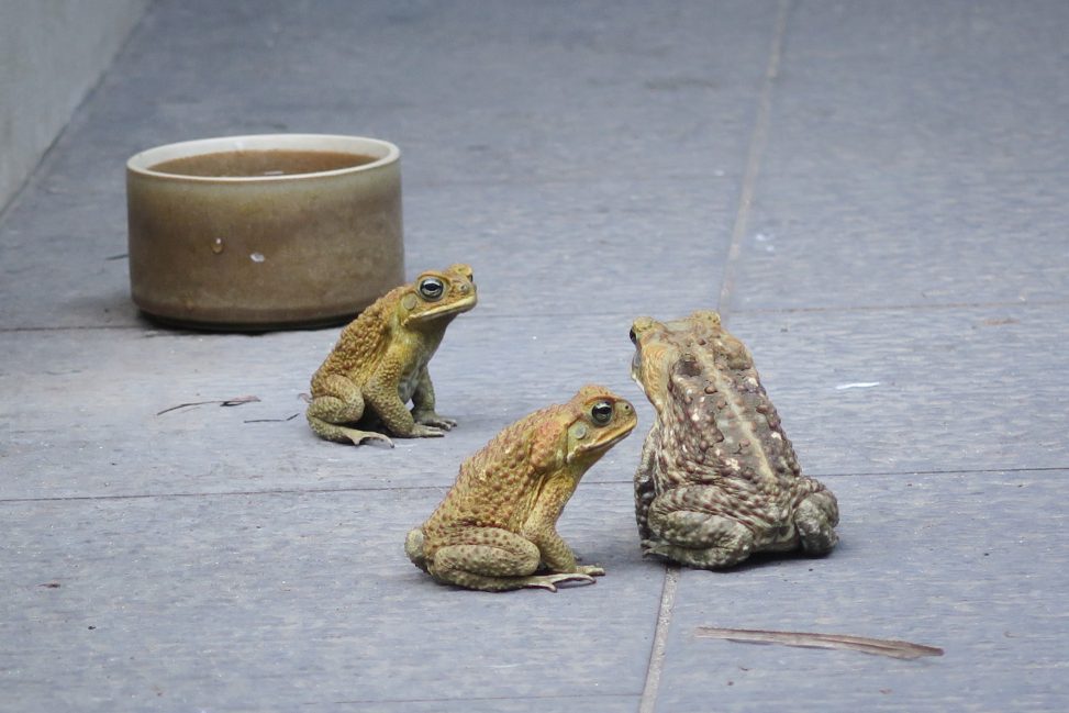 At dusk little frogs emerge and the lawns are alive with hipping hopping frogs. That intrigued us …………… but more was to come when we discovered that the frogs wait patiently outside the office, beside the cats dish, to get their evening snack.