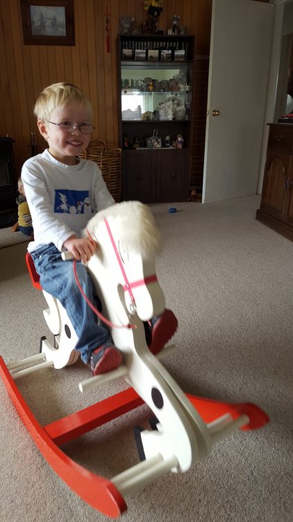 Afterwards, we headed over to see Grandad and A. While there CJ discovered the rocking horse and spent ages playing Cowboy!