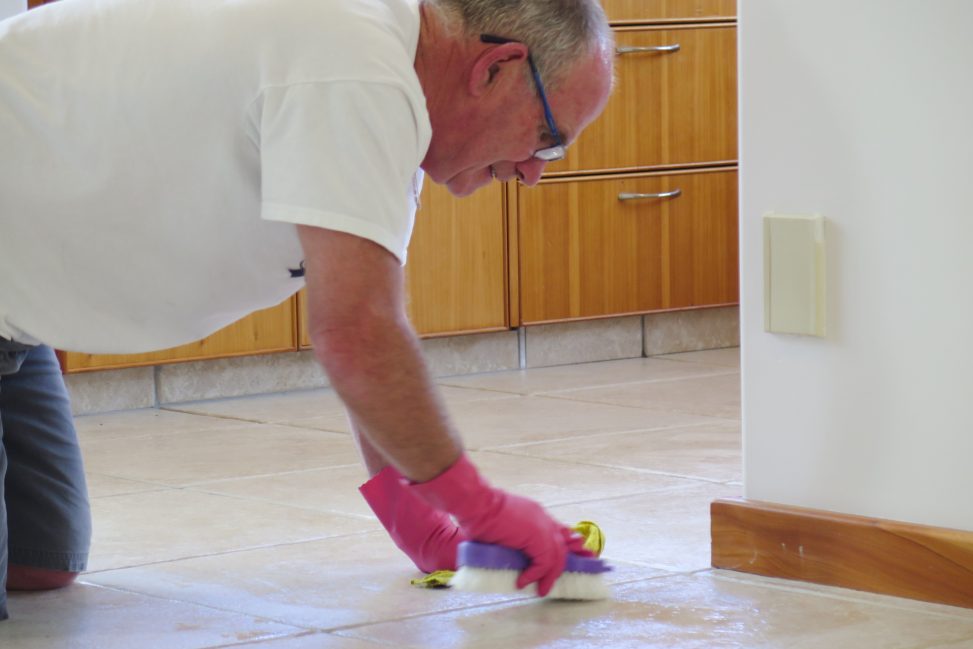 GD scrubbing the tiles to try and clean the old ones to match the new ones we put down where an island bar came out.  Fortunately there were spare tiles in the shed, and once everything was scrubbed it is difficult to tell the new from the old 🙂
