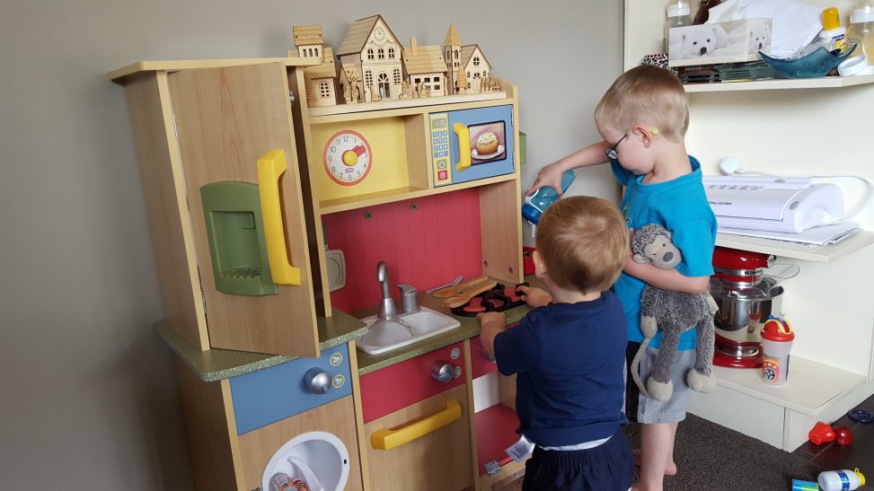 CJ loves the toy kitchen, he still spends hours playing with it. But today he started using it in a new way and he was busy teaching LJ what to do.