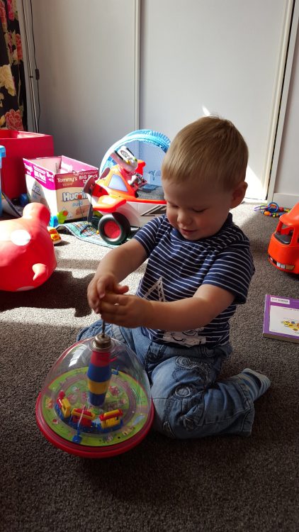 LJ loves his train spinning top. He got this last Christmas, we knew it was going to be a long time before he could use it, but today he got it.