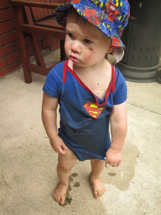 LJ and CJ had a blast making mud pies in gd’s garden ………. 31 degrees is a perfect water-play day. However LJ wasn’t so happy when he was soaking wet and rather muddy so wasn’t allowed inside. But after a clean up in the shower and a snack it was time for games – kicking the rugby ball over the goalposts on our lawn.