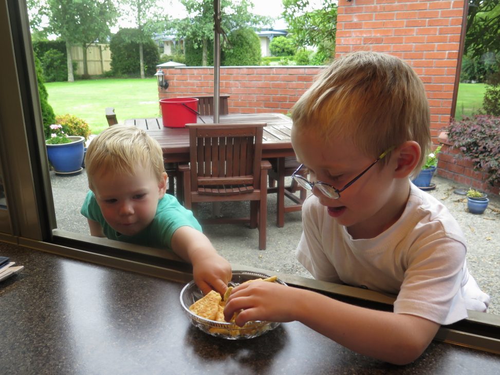 Very hot today so we had all the doors and windows wide open. Late afternoon these guys arrived so it was time for drinks and nibbles. I had placed this bowl on the bench ready to serve, but these two were very quick to climb onto the chairs in the courtyard and sneak a handful or two through the open window.