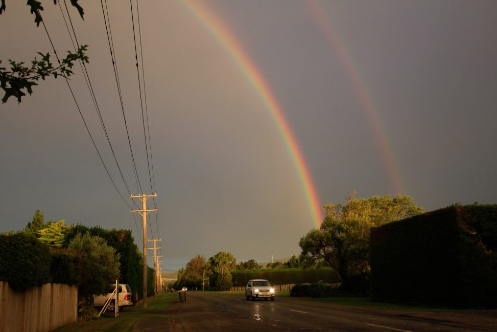 Strange light tonight so I went out to investigate ………….. and discovered a huge rainbow arching over our neighbourhood (extra photo), but I like the brightness in the photo I took out our back gate.