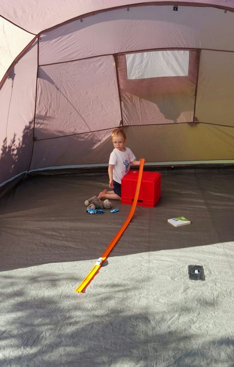 CJ was very excited – were still banging in the pegs while he was busy setting up his race cars inside!