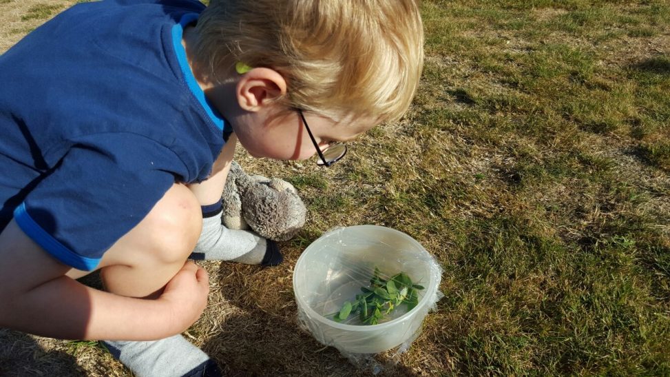 When CJ arrived home from kindy, there was a surprise for him – Nan Be had found some insects for him to look at. There was a grasshopper and a praying mantis.