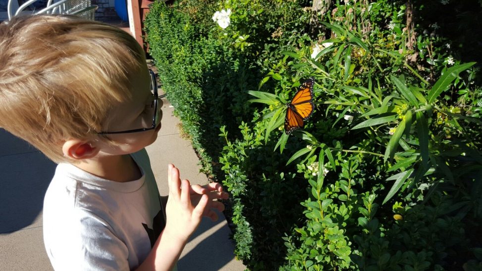 The butterfly was happily sitting there warming is wings. CJ was fascinated. And when it was time to go, he waved and said bye bye butterfly!
