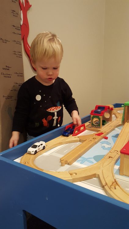 As they were so helpful, they were allowed to stay up a later then normal. LJ decided to use that time to play with his cars on the train tracks! Even though there is really only one way for them to go, it still took a lot of concentration.