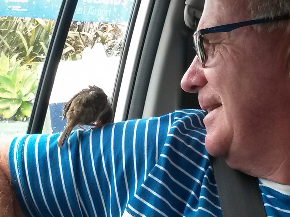 GD with a pet sparrow which belongs to the girl where we hired a car, and goes everywhere with her – even in the car to the airport when she dropped us off!!