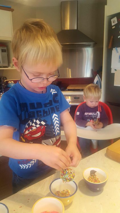 CJ loved it – he was so careful dipping them into the chocolate and then sprinkling the different toppings over them.