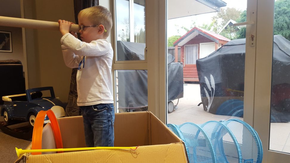 Today CJ made a boat – all by himself. He started with the hull (a box), he then added a motor (the washing basket), a steering wheel (hot wheels track) and a spy-glass!