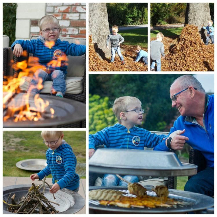 While the boys were playing in the leaves, CJ said “I’m going to build a camp fire”. So, we asked if he wanted to build a real one… And if course he did. So he collected some fallen sticks and put them in the buggy.