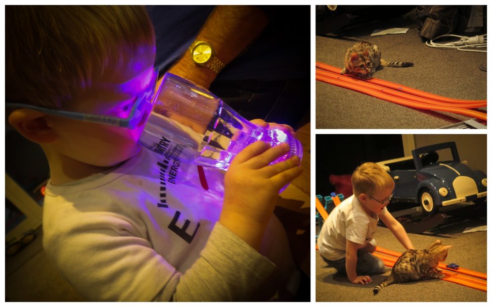 LJ was fascinated by the flashing lights in his new plastic beaker, while CJ had to check which of his new cars was fastest …………… and Toffee was never far away from the action 🙂