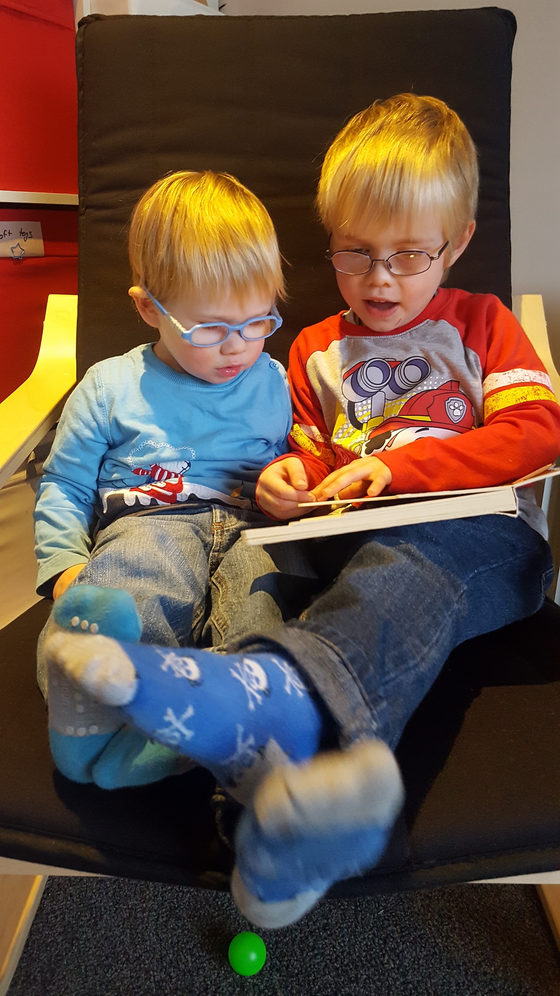 This was the lovely surprise I got when I walked into the playroom – the two of them reading a book about trucks!