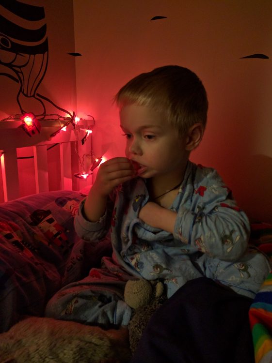 I know this innocence won’t last for long, so we lined up a lolly dinosaur beside his bed for him.