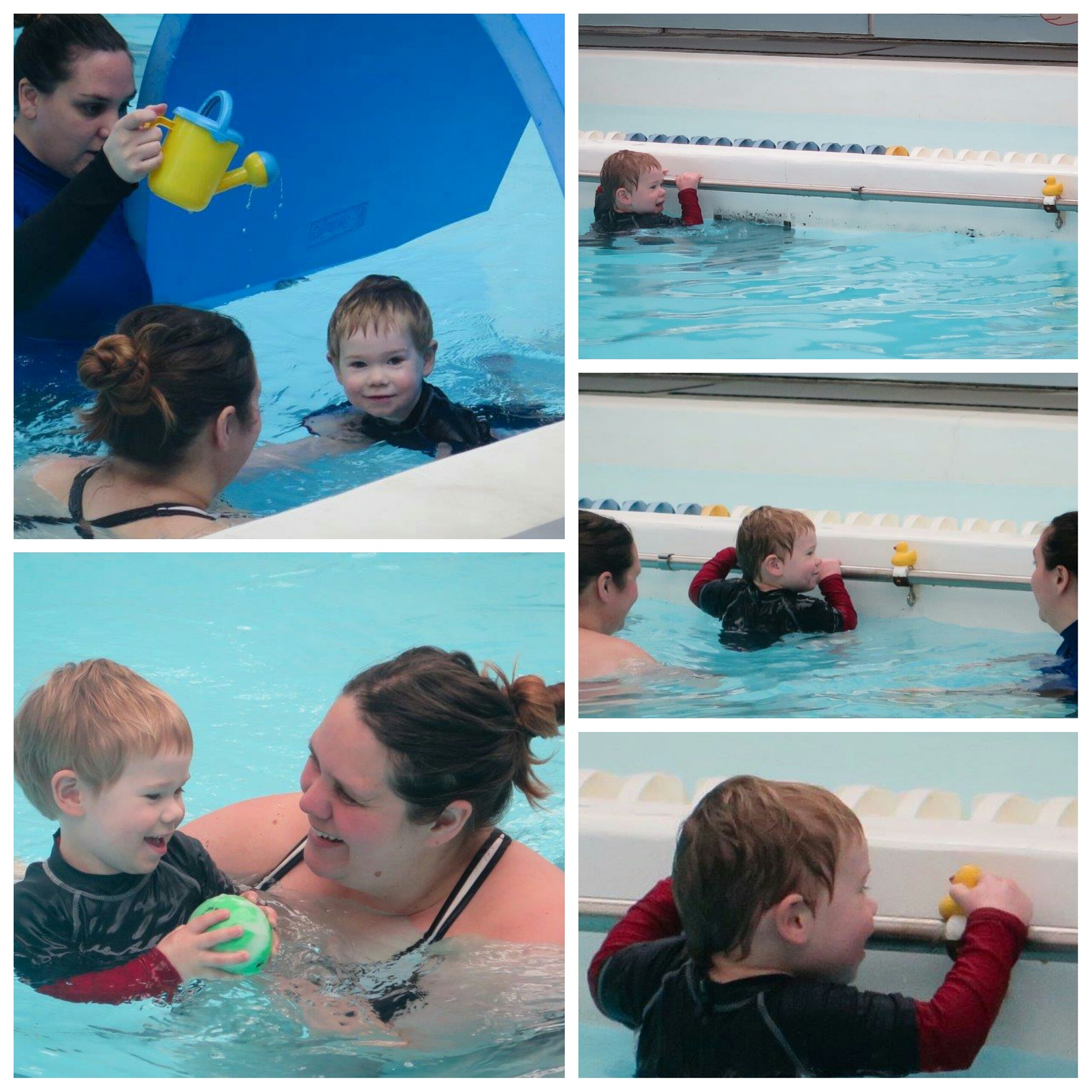 LJ has made huge improvments with his swimming. He no longer holds tightly onto me, and is more than happy to reach out for the toys floating on the water. He also loves going through the tunnel and jumping off the floating mat.