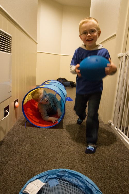 I arrived home tonight to S1 setting up cones down the hallway. Then she found a tunnel and put it around the corner and set up a basket for them to score a try in.