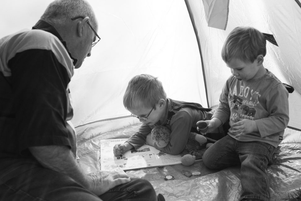 The boys stayed with us for a while this afternoon while s1 & s2 worked in their garden. It was a glorious day so they played outside all the time – races around the lawn and ball throws for molly were the favourites, but when they needed some quiet time it was a picnic then story time in the tent.