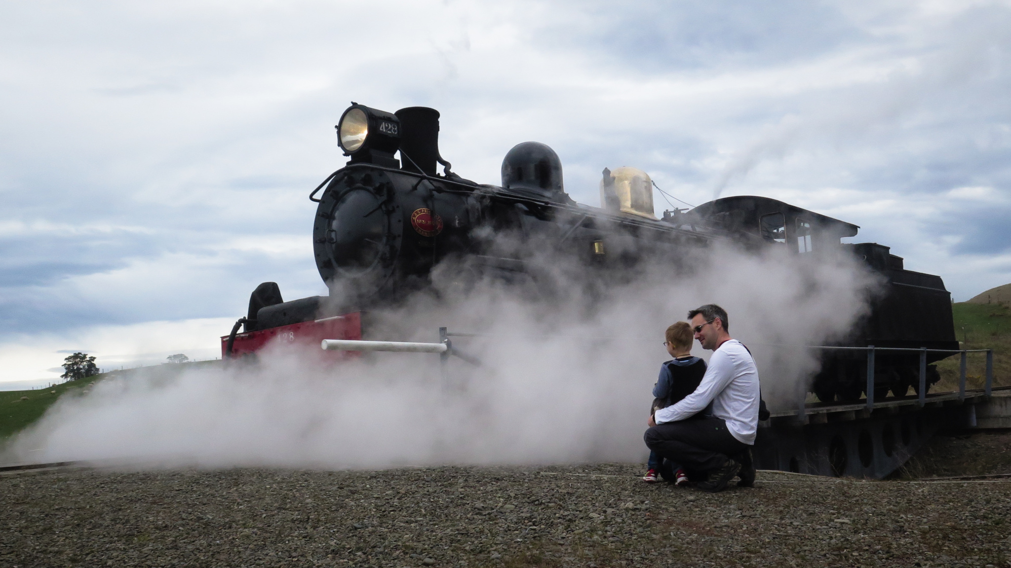 A ride on the Weka Pass steam train today. The boys loved it and CJ was fascinated when we arrived at Waikari as the engine was turned around on a turntable. No technology here as the engineers had to push it around using brute force …………. and then stop it when had turned through the half circle