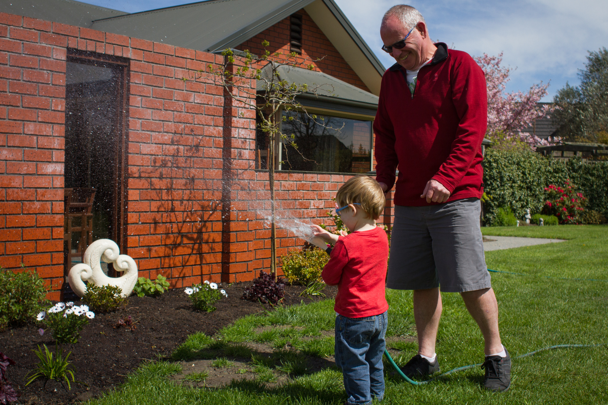 GD decided to hand water the lawn where he has planted some grass seed in the bare patches ………………….. but LJ had another idea on who should be in charge of the hose.