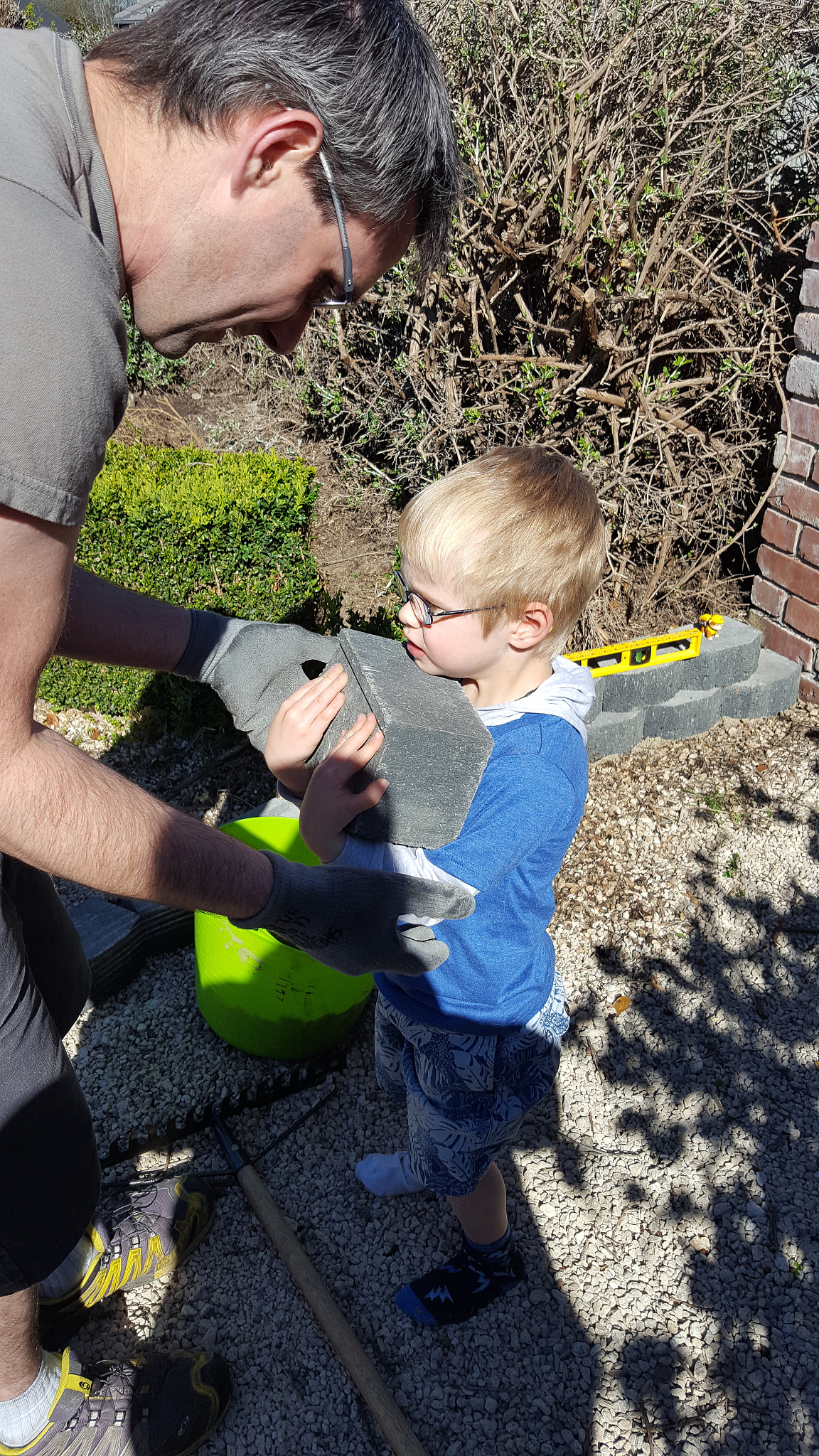 CJ was pretty nervous around the heavy blocks after his incident with the paving stone still fresh in his mind. It took a bit of coaxing to get him to hold the block by himself but I think it was good for his confidence.