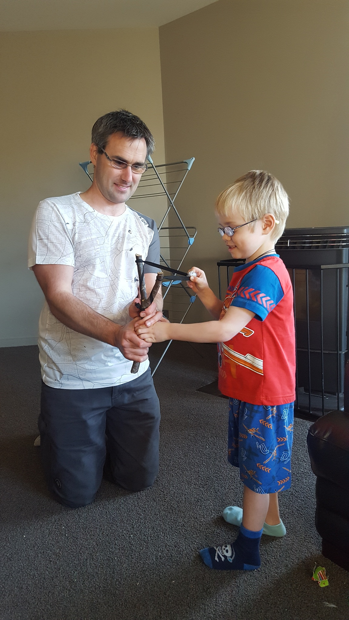 First they added an elastic band and found something suitable to shoot. Then they had a talk about what you can and can’t aim at. Then finally it was time to test it out.