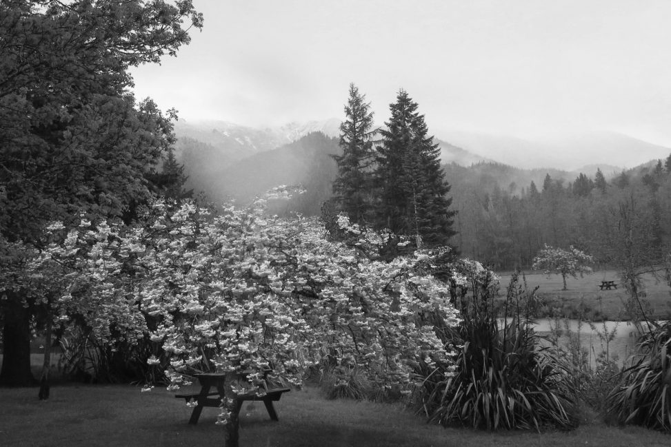 The flowering cherry laden with blossom looks like snow ……… but the snow on Mt Isobel made it a very cold day in Hanmer Springs.