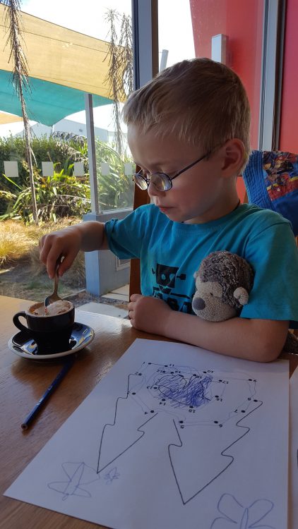 At brunch, the boys were given some colouring in. CJ had a dot-to-dot, he carefully followed the numbers, discovering what the picture was! He loved it. And he made sure he added more trees and some friends for the bear.