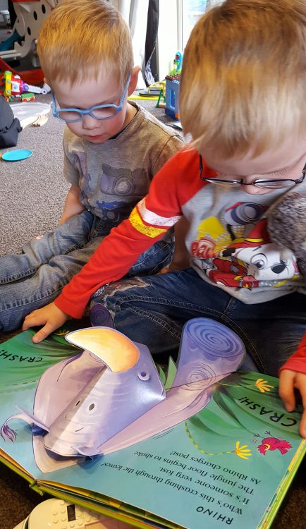 Like CJ reading to LJ. They are both fascinated by the pop-up animals. CJ was very inventive with his commentary of each one and LJ listened intently.