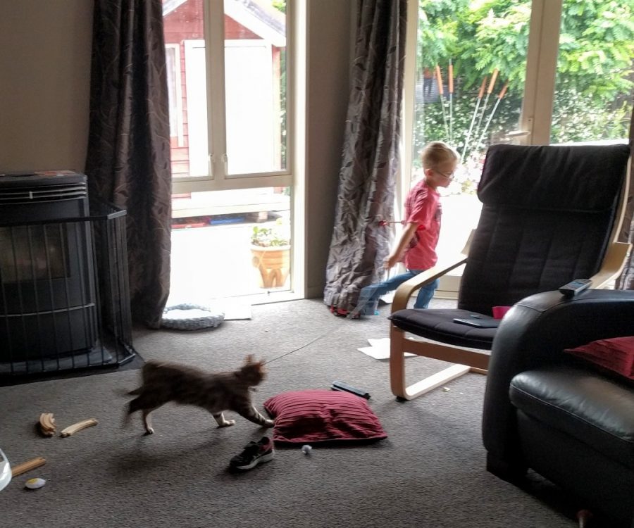 The 2 boys and the cat went around and around the lounge tonight.