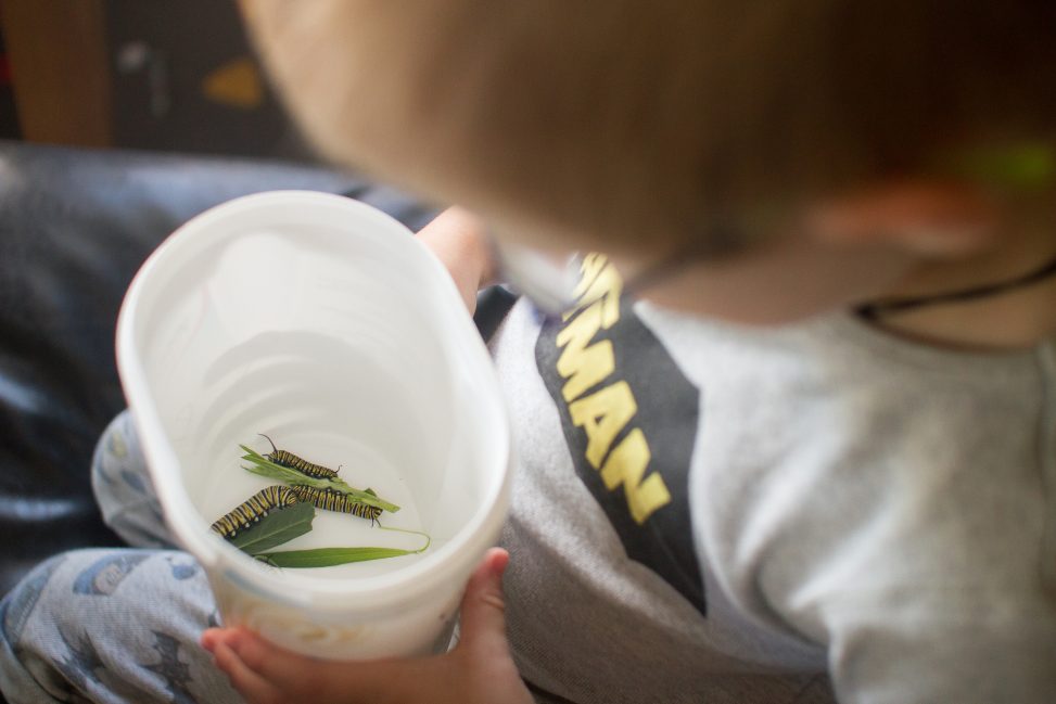 CJ absolutely loves the monarch butterfly catterpillers that we have on our swan plants.