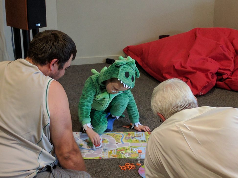 Tonight Grandad and Uncle C came over for dinner. CJ was very excited and wanted to show them his favourite costume – a dragon!