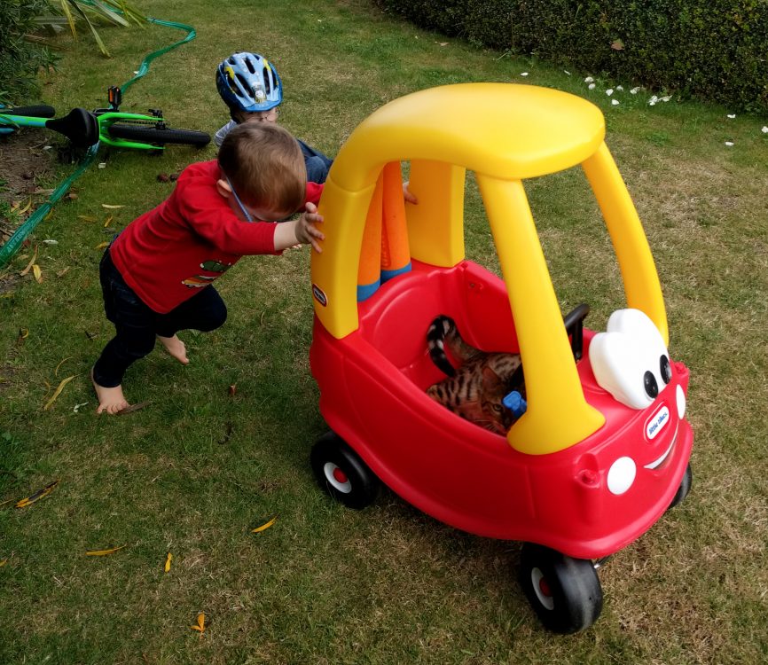 I can’t believe she put’s up with this… letting LJ push her around and around the garden in his toy car. She really is an amazing cat.