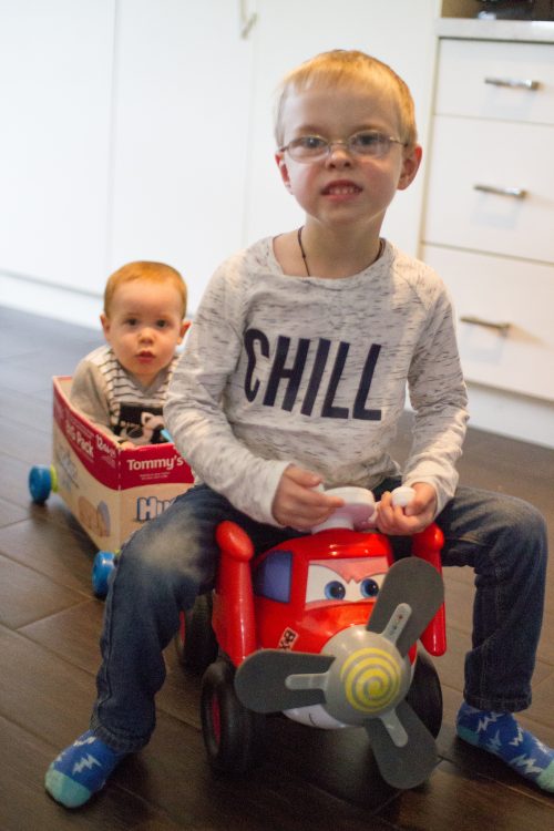 but he made up for it with this hillarious moment giving an 11 month old a ride around the house towed behind Dusty.