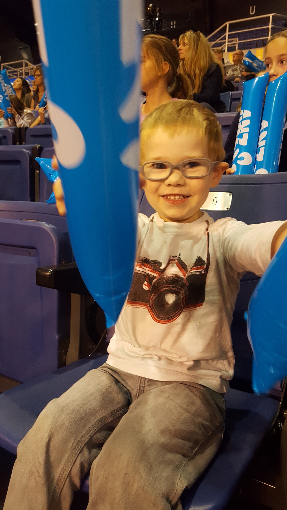 LJ was fascinated for the first quarter, he watched as the players ran up and down the court, passing the ball. He then spent the first bit of the the next quarter playing with the noise sticks – but then he got bored and wanted to play with the seats and visit the others in the crowd.