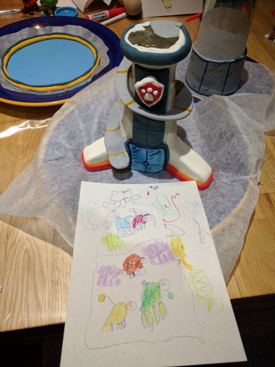 CJ drew a picture of what he wanted for his cake – the Paw Patrol lookout from his favourite TV show, with all the Paw Patrol pups and vehicles.