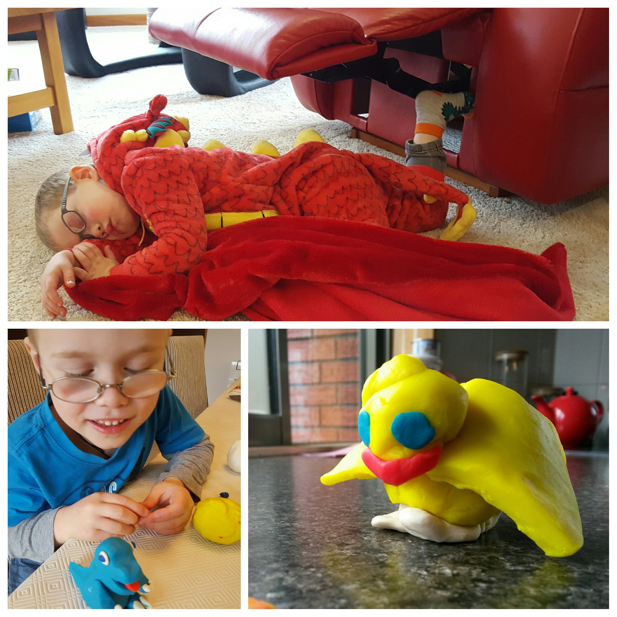 Our little dragon, LJ, wore himself out running around the house and took a quick nap in his favourite chair. However, after he had been asleep for about 15 mins there was a soft thud – somehow he had fallen off the chair, but remarkablely he was still alseep! I don’t think this had ever happened before, normally the slightest movement and he’s awake – guess it’s the dragon outfit!