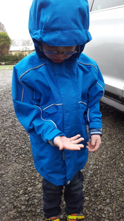 Today after CJ’s swimming lesson (in which he is showing huge improvement from the start of the week) we got caught on a hail shower while getting into the car. CJ loved it and was fascinated by the little hail stones.