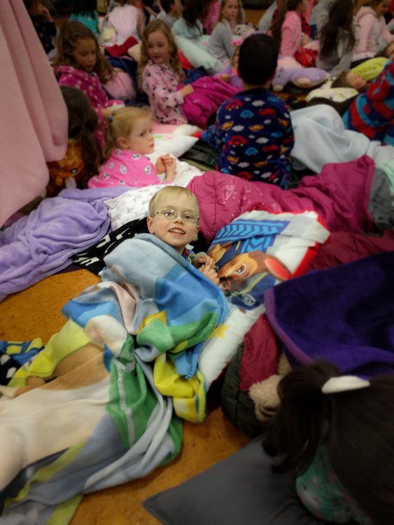 CJ had amovie night at school tonight. PJ’s popcorn, blankets and pillows… and a hall jam packed with kids.
