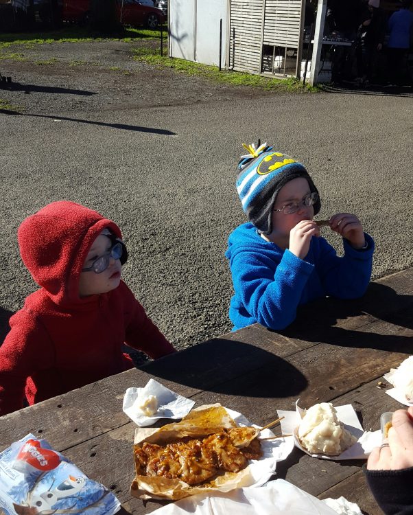 The boys loved their lunch of sweet’n’sour pork and steamed buns. CJ also enjoyed our chicken satay sticks.