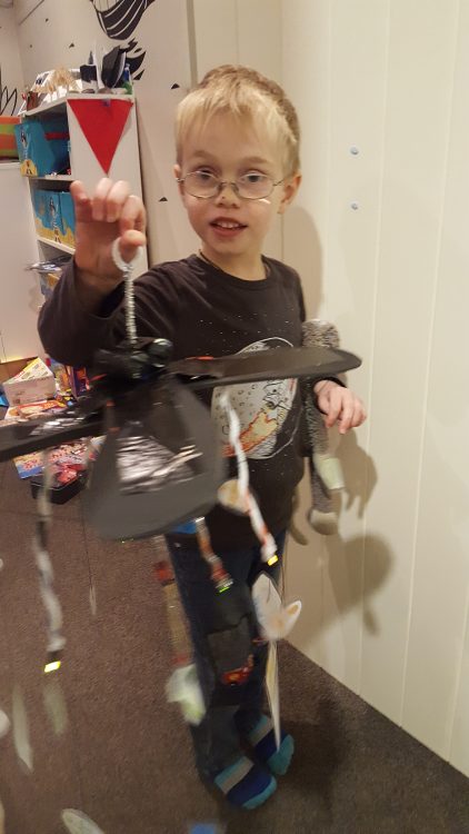 He’s so proud of his creation. It’ll head off to school tomorrow to be entered in the ‘book week, make a mobile’ competition.