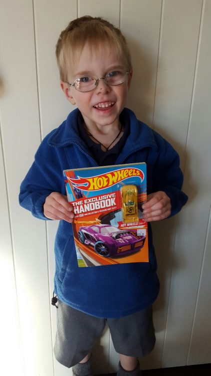 He was allowed to pick a new book. So after a lot of looking and deliberations, he picked a hot wheels one.