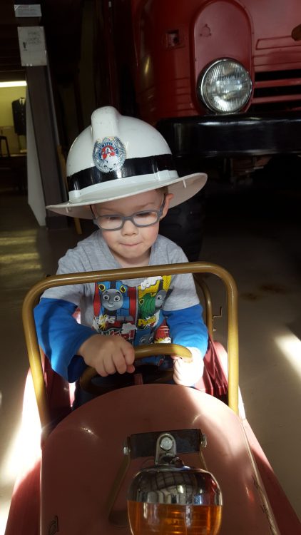 LJ had to try all the trucks, before settling on his favourite – the little pedal version, complete with fire hat!