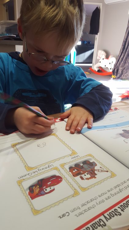 Today I gave CJ a new book. One about reading comprehension, with Lightning McQueen.